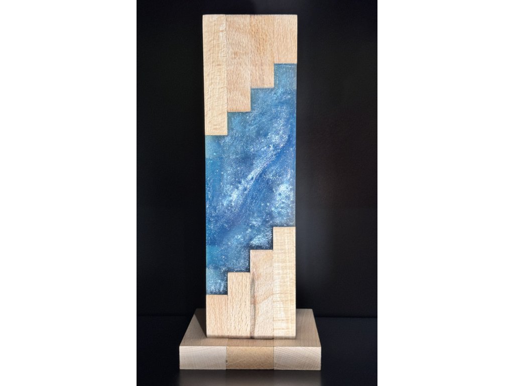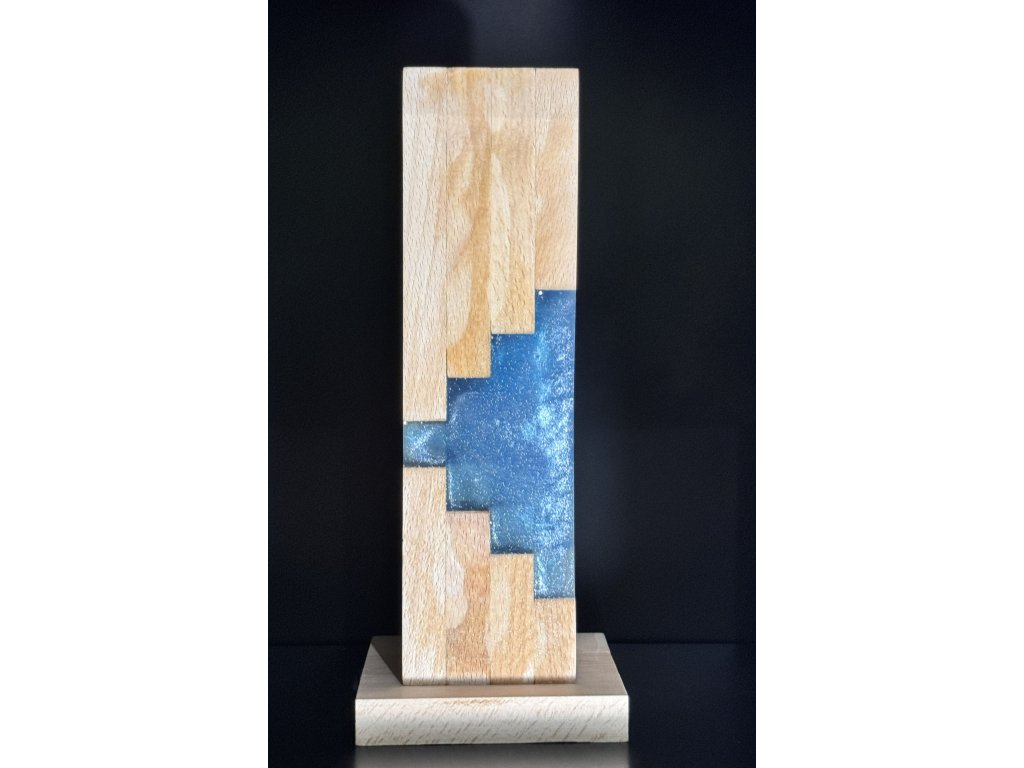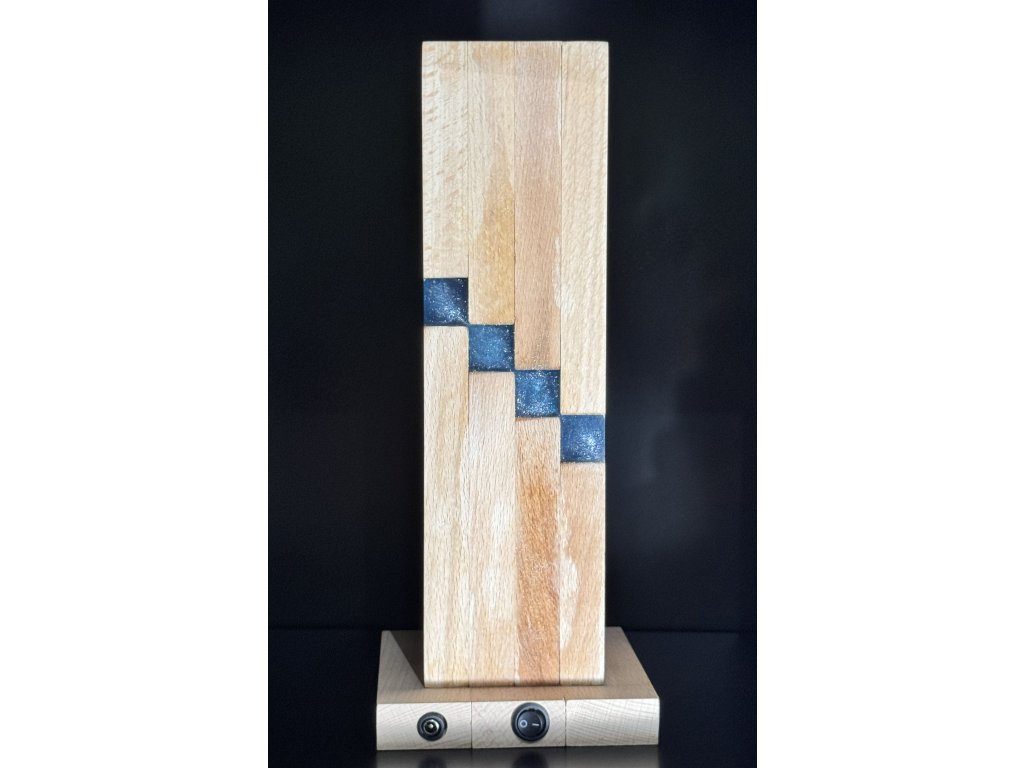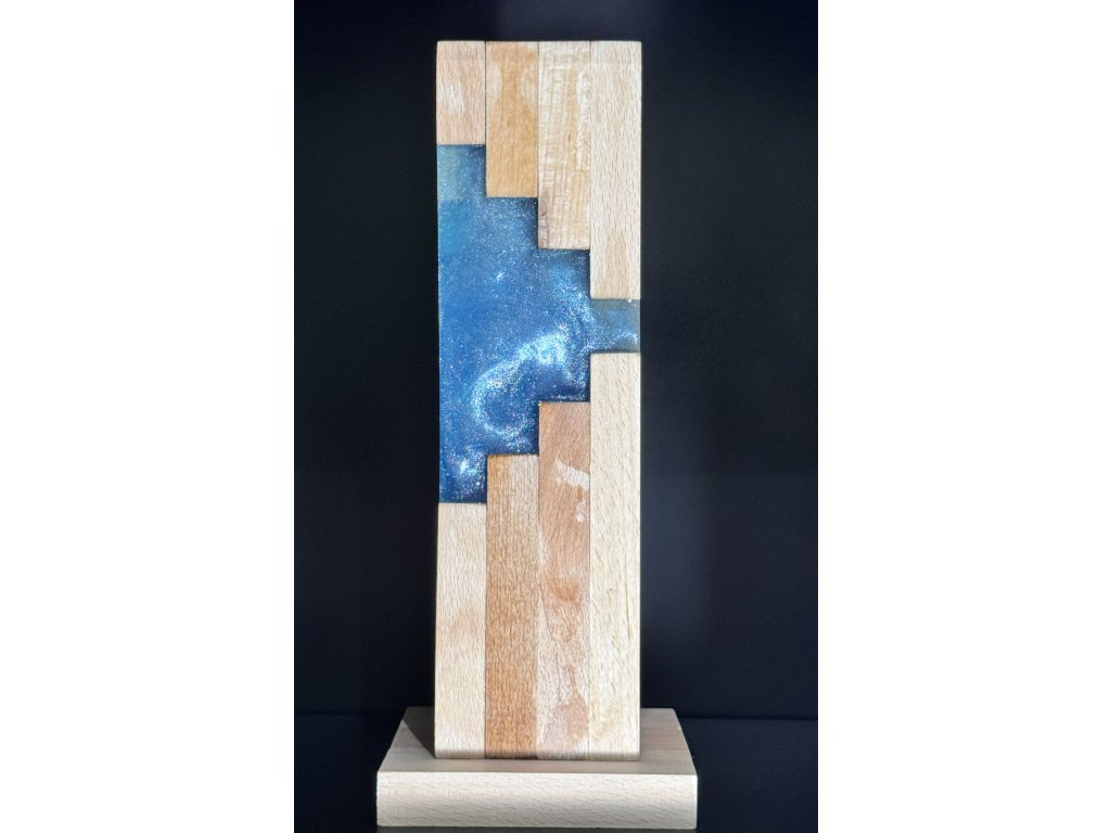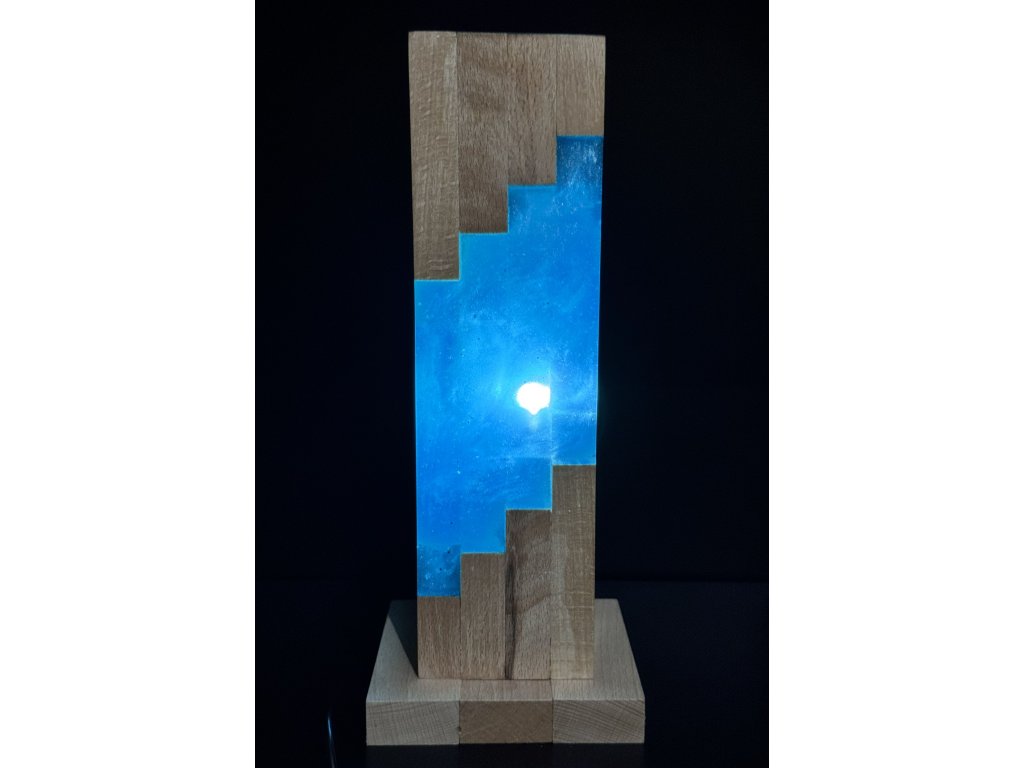 Ručně vyráběná lampička z epoxidové pryskyřice a přírodního dřeva, jejíž modrá barva se hodí do pracovny nebo všude tam, kde se potřebujete soustředit na svou práci.