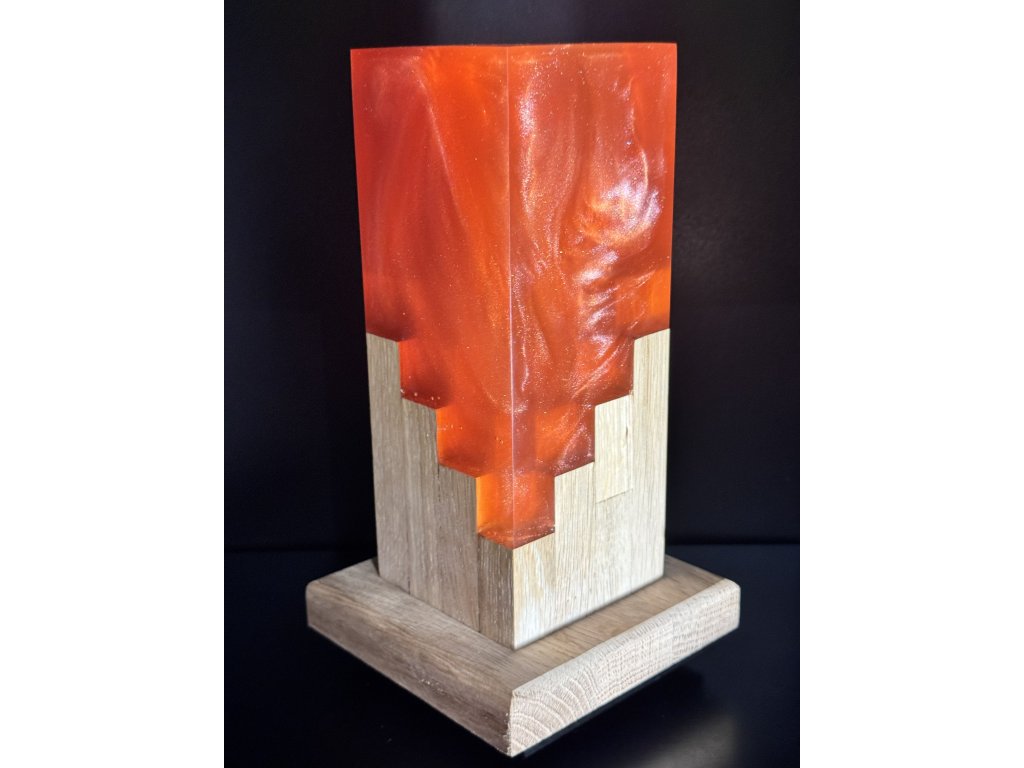 Ručně vyráběná lampička z epoxidové pryskyřice a přírodního dřeva, jejíž barvy západu slunce či ohně navodí příjemnou atmosféru při usínání. Naše mysl je již odpradávna nastavena tak, že oranžovo červené barvy západu slunce či pradávného ohně našich jeskynních předků, v ní navodí příjemné pocity uklidnění a harmonie. Narozdíl od modrého denního světla či modrého světla displejů mobilů, tabletů, či počítačů, které naopak usínání brání.